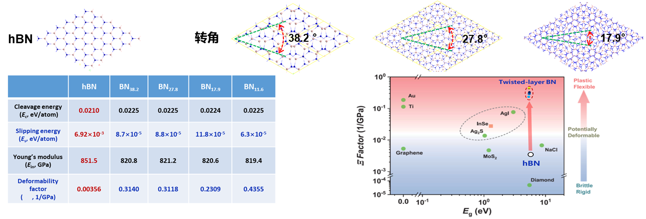 研究发现相比于六方BN, 转角层状BN(亚稳结构)本征变形能力因子提升 2 个数量级,为开发塑性陶瓷提供了崭新途径