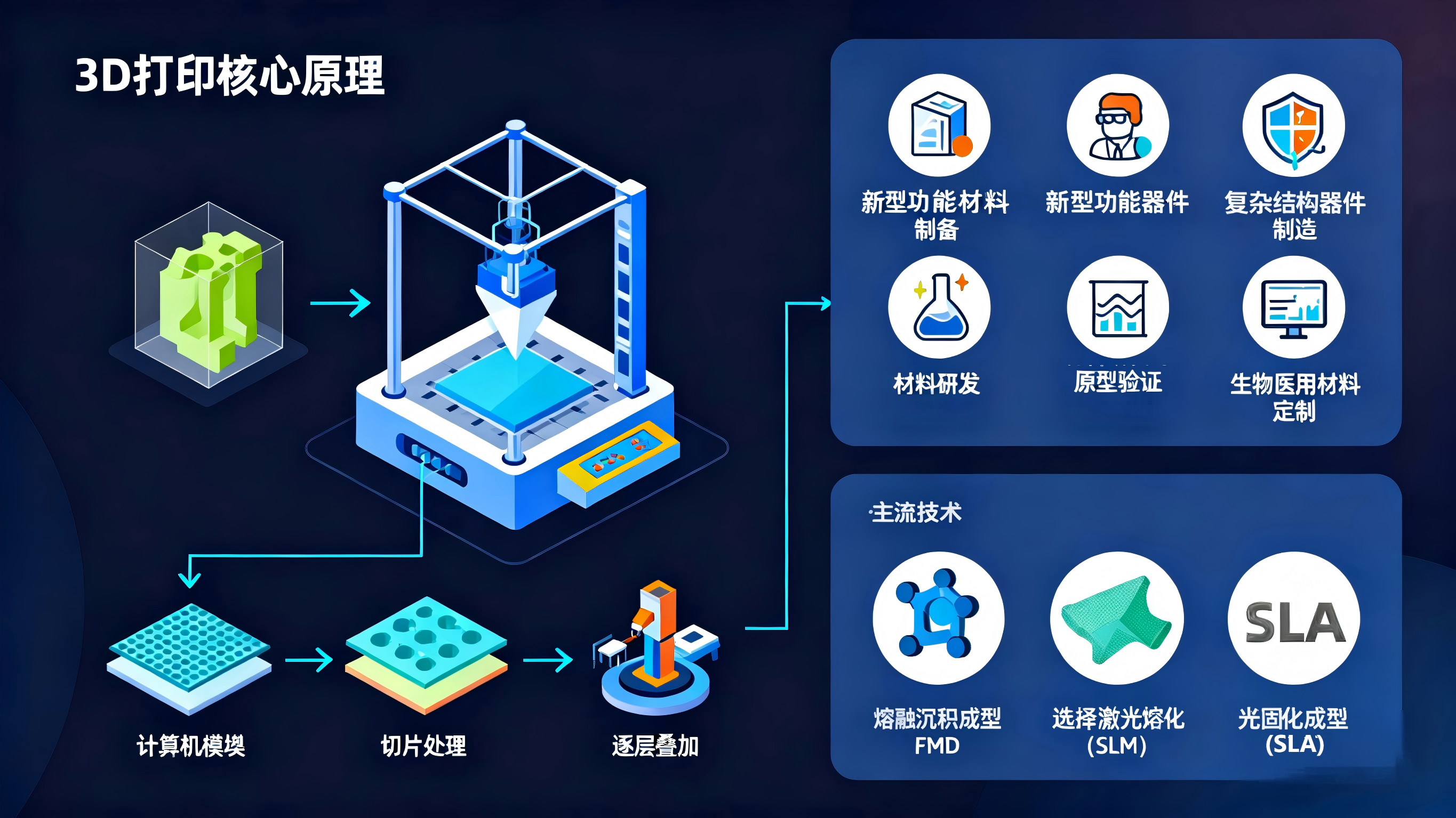 3D 打印通过 “分层制造、逐层叠加” 的原理,实现了复杂结构材料的定制化制备,广泛应用于新材料开发、功能器件制造等场景